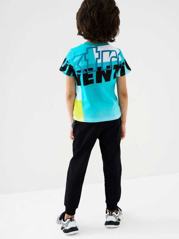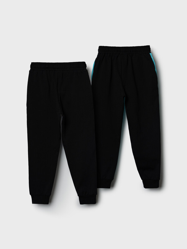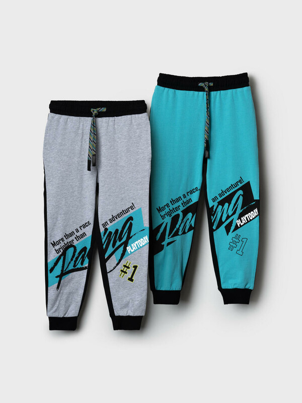 Комплект детских брюк-джоггеров для мальчика. Набор из двух джоггеров выполнен из хлопкового трикотажа джерси. Модель прямого кроя со средней посадкой на талии. Пояс выполнен на резинке, дополнительно регулируется шнурком. По бокам — удобные карманы. В нижней части брючин предусмотрены эластичные трикотажные манжеты для лучшей фиксации. Украшены принтами.