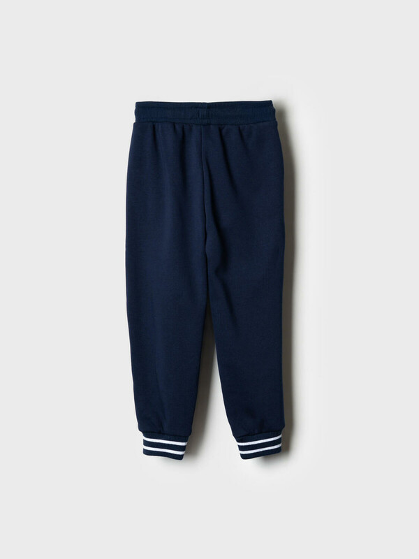 Трикотажные детские брюки джоггеры для мальчика. Модель выполнена из футера без начеса. Пояс на широкой резинке дополнен декоративным шнурком с надписью "FIND & JOY". По бокам расположены удобные карманы. Низ брюк оформлен эластичными манжетами с контрастными полосками. Брюки подойдут для повседневной носки и активного отдыха.
