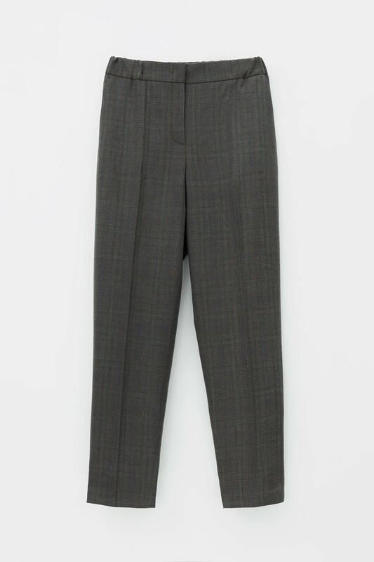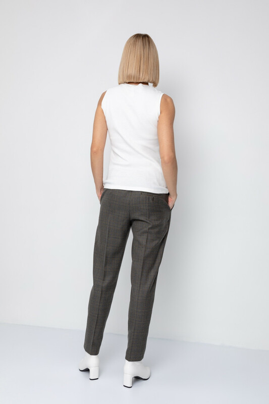 Брюки из костюмной ткани с добавлением шерсти в клетку прямого силуэта, слегка зауженные книзу с боковыми карманами и заутюженными стрелками. Комфортый пояс на резинке. Застегивается спереди на молнию и брючный крючок.