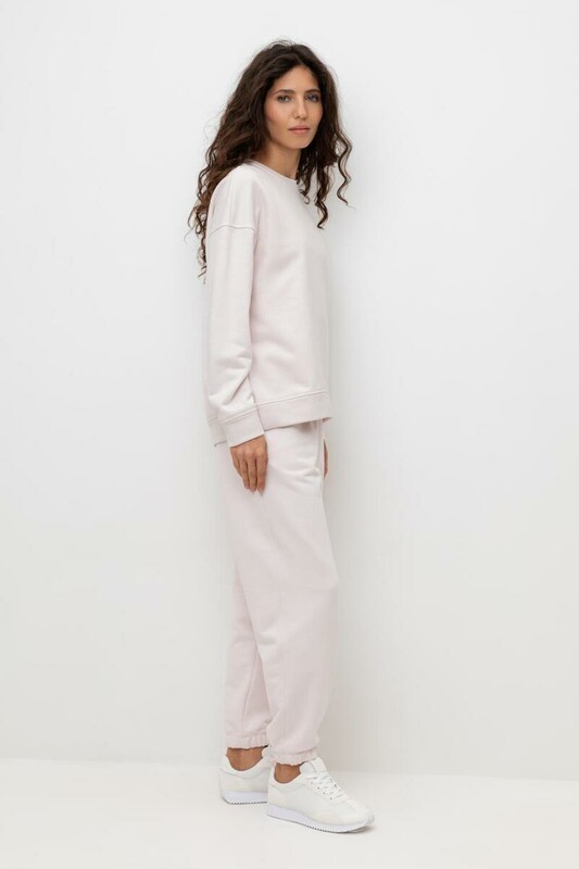 Брюки из мягкого двухцветного футера. Внутренняя сторона изделия представлена в натуральном цвете хлопка, внешняя в нежно-розовом. За счет использования крашенной пряжи, данный вид полотна прошел минимальную обработку, что придало изделию мягкость и шелковистость.