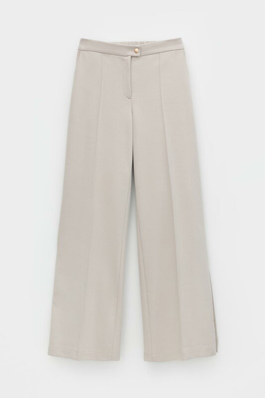 Свободные женские брюки с разрезами и боковыми карманами из плотного гладкого трикотажа интерлок. Низ обработан плоскими швами.