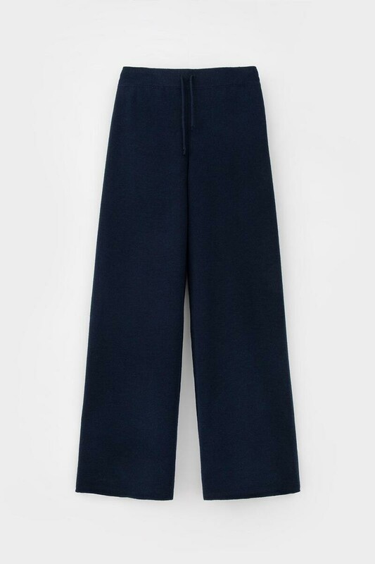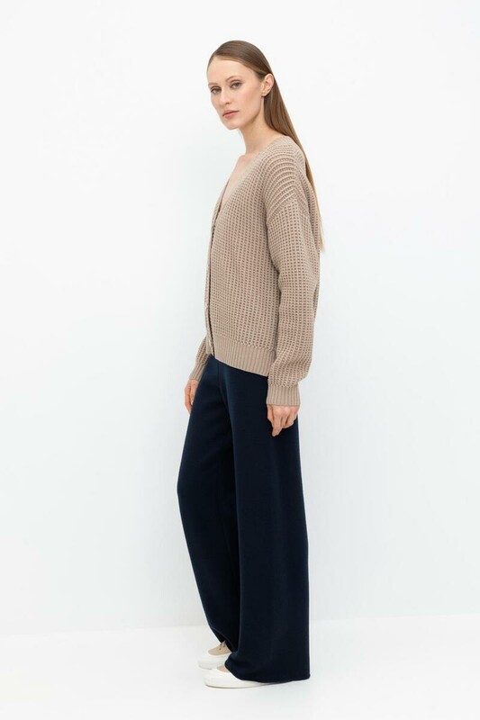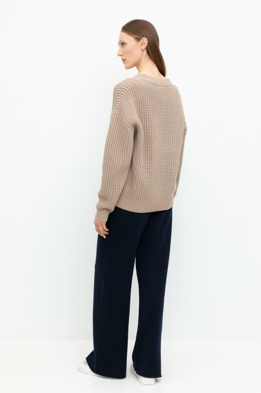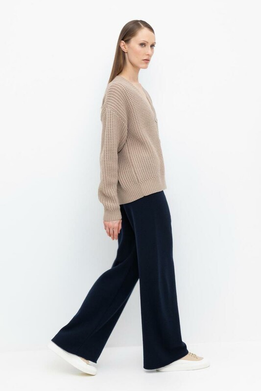 Пояс регулируется вязаным шнуром в тон брюк. Плотная фактура вязания согревает и сохраняет форму во время носки.