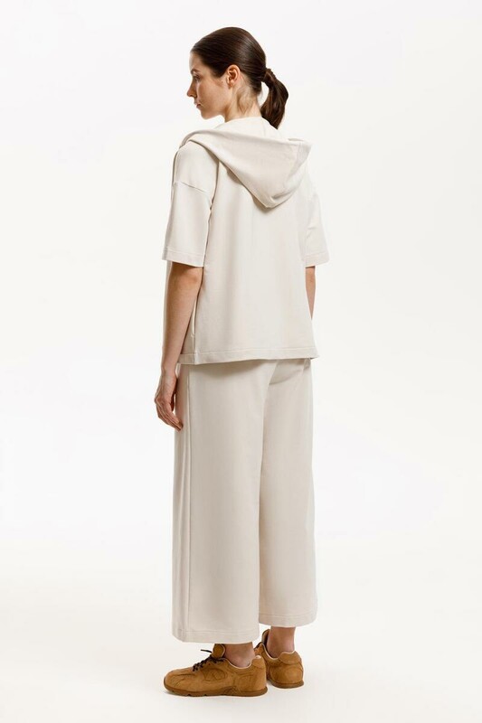 Широкие укороченные брюки из мягкого эластичного футера создают непринужденный образ. Высокий пояс с имитацией застежки и защипы придают брюкам расслабленный стиль. Подарите себе комфорт и свободу с нашим качеством.