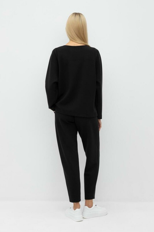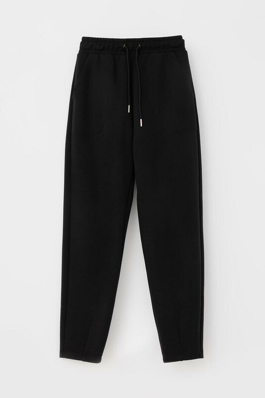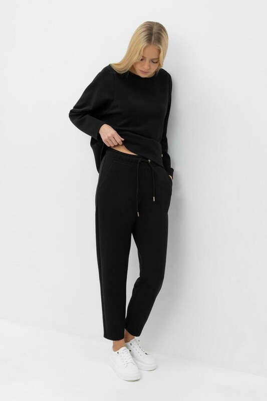 Женские брюки зауженного кроя с боковыми карманами из плотного гладкого трикотажа интерлок. Пояс со шнурком позволяет регулировать посадку.