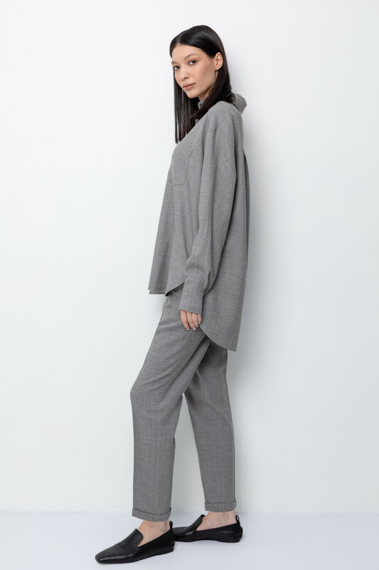 Брюки из мягкой меланжевой ткани с добавлением шерсти прямого силуэта, слегка зауженные книзу, с боковыми карманами, заутюженными стрелками и подворотами. Комфортый пояс на резинке.