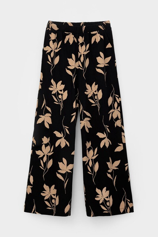 Легкие женские брюки на резинке с удобными карманами из набивного трикотажа супрем. Низ обработан плоскими швами.
