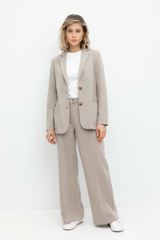 Свободные женские брюки со стрелками и боковыми карманами из плотного гладкого трикотажа интерлок. Застегиваются на молнию и кнопку. Низ обработан плоскими швами.