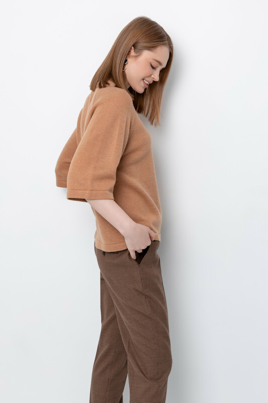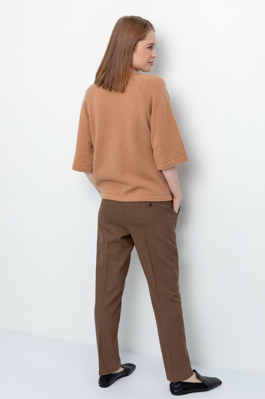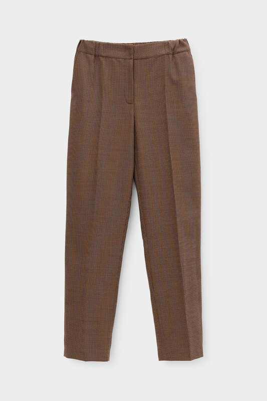 Брюки из костюмной ткани с добавлением шерсти с узором "гусиная лапка" прямого силуэта, слегка зауженные книзу с боковыми карманами и заутюженными стрелками. Комфортый пояс на резинке. Застегивается спереди на молнию и брючный крючок.