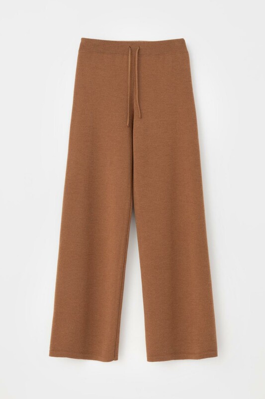 Пояс регулируется вязаным шнуром в тон брюк. Плотная фактура вязания согревает и сохраняет форму во время носки.