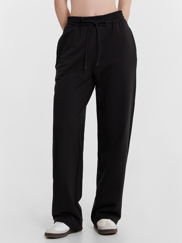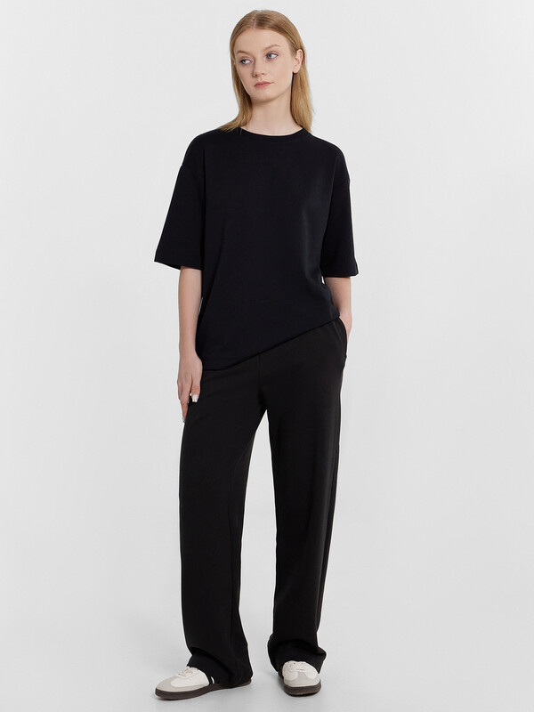 Женские свободные брюки идеально подходят для тех, кто ценит комфорт и стиль. Средняя посадка и боковые карманы обеспечивают удобство при носке, а эластичный пояс со шлевками, в которые втянут шнур в тон, добавляют функциональности и эстетичности изделию. Нижние срезы брюк аккуратно обработаны швом вподгибку, что придает изделию завершенность и аккуратность. Эти брюки легко сочетаются с различными элементами гардероба, создавая стильные и современные образы для любого случая. Добавьте их в свой гардероб и наслаждайтесь сочетанием комфорта и лаконичного дизайна каждый день.