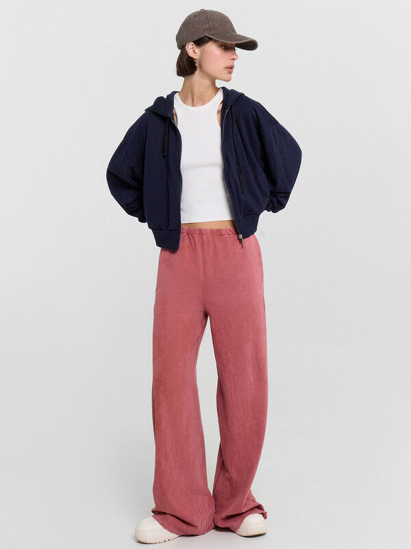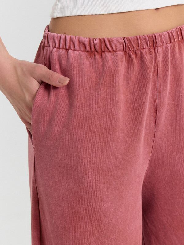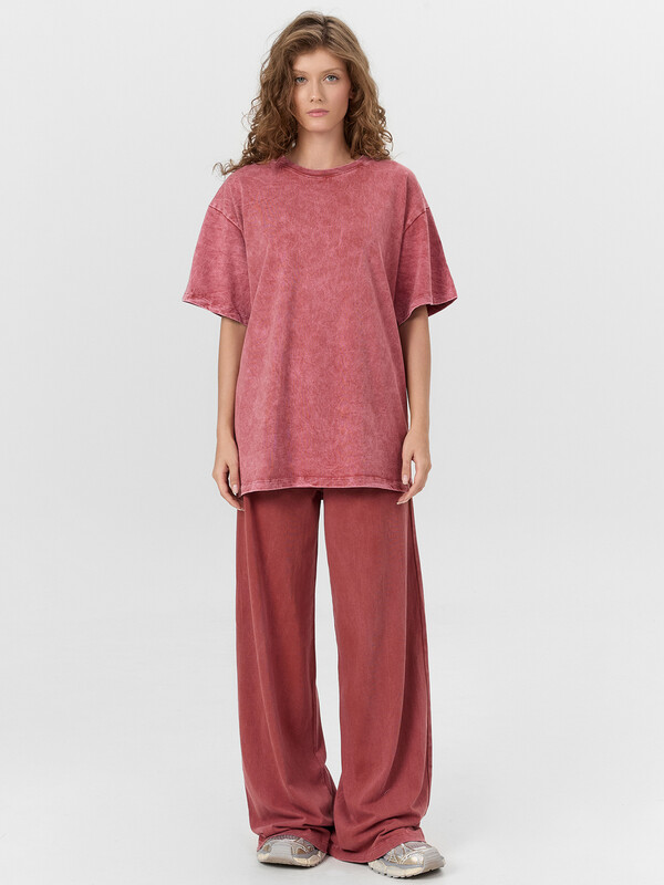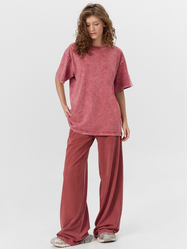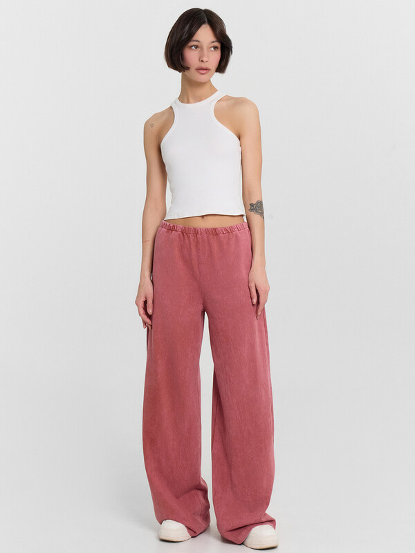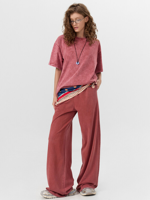Брюки прямые, свободного силуэта. Посадка средняя, сиденье опущено. Пояс цельнокроеный с эластичной тесьмой внутри (вн. 20мм 20RV). В боковых швах обработаны карманы. Подкладка кармана из основного полотна. Нижние срезы обработаны швом вподгибку.