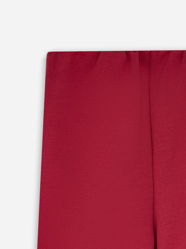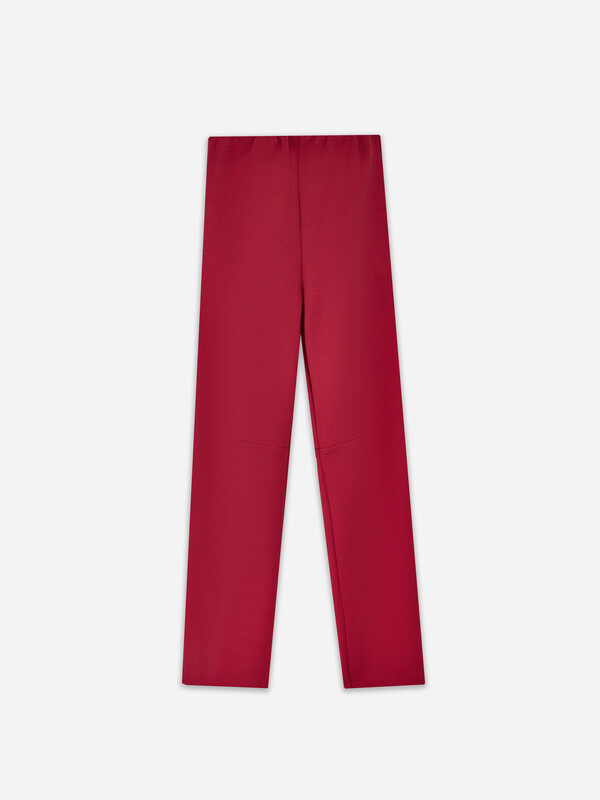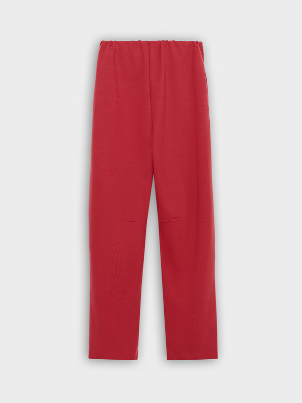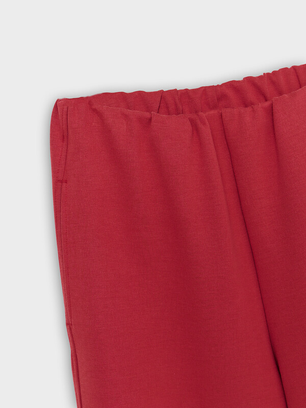 Боковые швы смещены вперед, чтобы создать более плавный и женственный силуэт. На поясе предусмотрена мягкая резинка, а в боковых швах спрятаны удобные карманы. Особый крой в области колена позволяет брюкам сохранять свою форму и не сковывать движения при ходьбе.