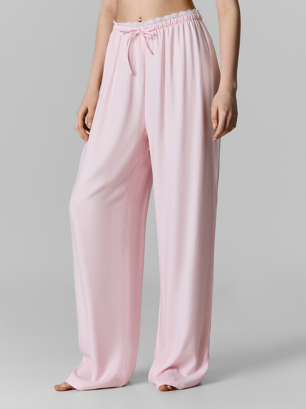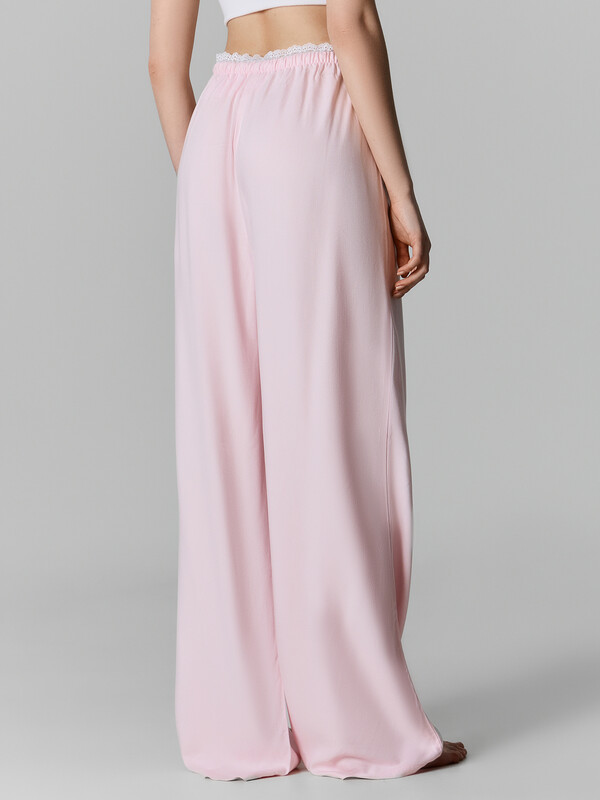 Брюки прямые свободные, посадка средня. Пояс цельнокроеный с эластичной тесьмой внутри (внутр. 20RV). С внешней стороны пояса пробиты петли и вставлен шнур-бейка из основного полотна. По верхнему срезу отделка из кружева 2.4см (L156-2.4, арт. JS00017-2.4). Брюки с боковыми швами. Нижние срезы обработаны швом вподгибку с закрытым срезом.