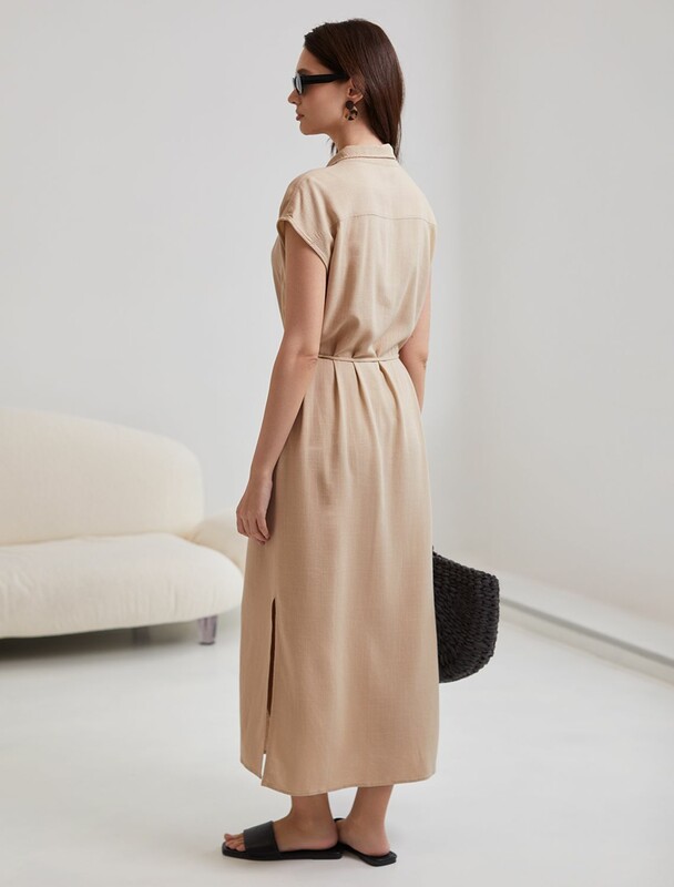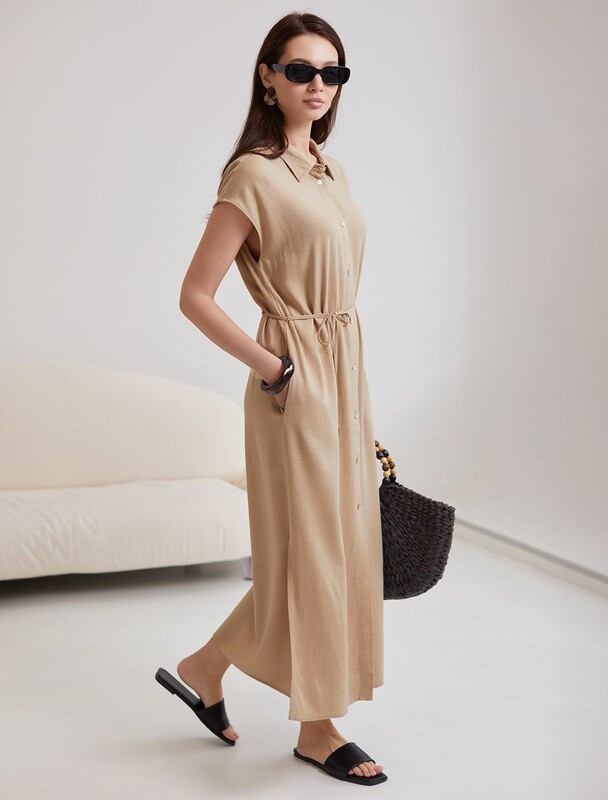 Длинное платье-рубашка с поясом и разрезами изо льна с вискозой