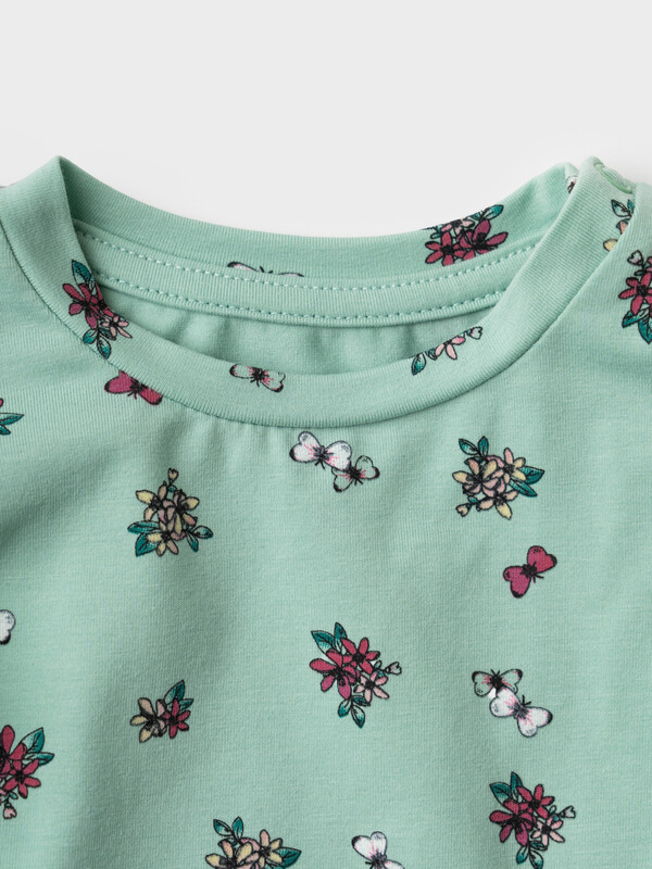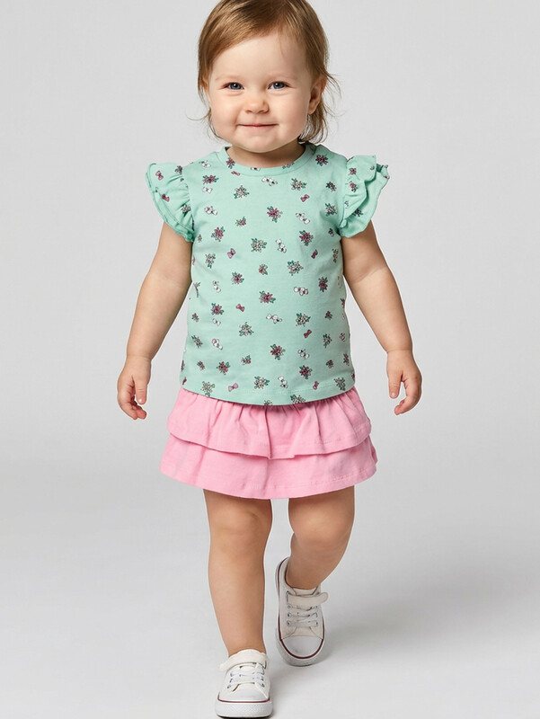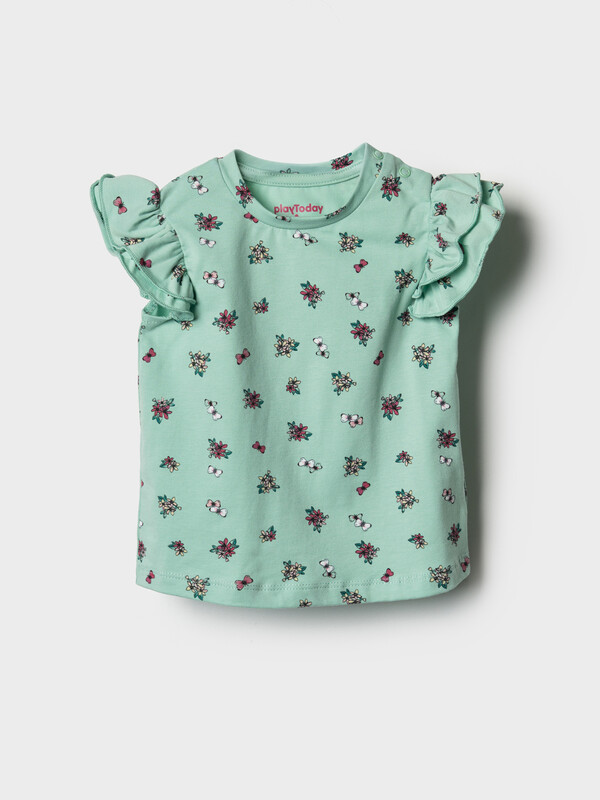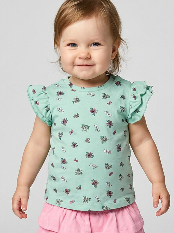 Детская футболка для девочки. Модель прямого кроя, выполнена из эластичного хлопкового трикотажа джерси. Принт с цветами. Горловина круглая. На плече застежка на кнопки для удобного переодевания. Рукава-крылышки.