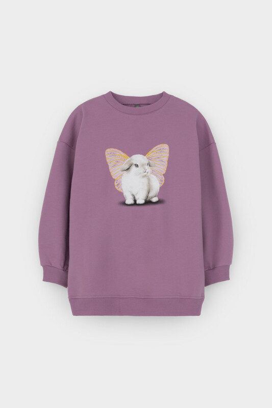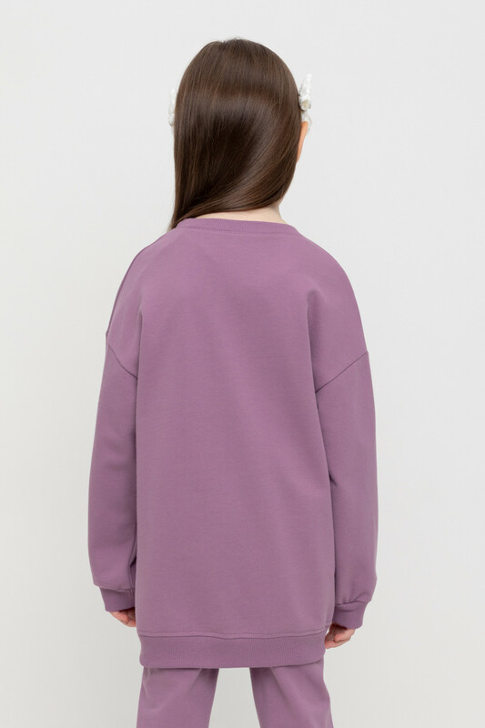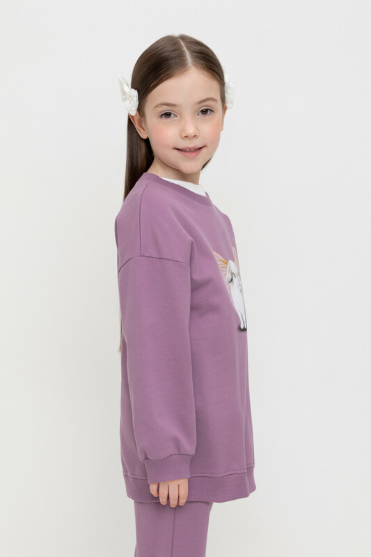 Удлиненный свитшот для девочки из высококачественного футера трехнитки. Обтачка горловины, манжеты и пояс выполнены из эластичного полотна. Оригинальный принт выполнен из стойких текстильных красителей.
