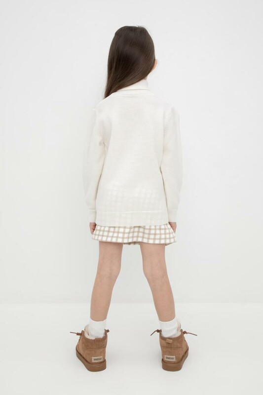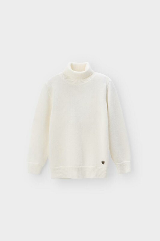 Вязаный джемпер для девочки из мягкой полушерстяной пряжи. Высокий воротник с отворотом хорошо защищает от холода. Изделие сохраняет форму и стойкий цвет после многочисленных стирок.