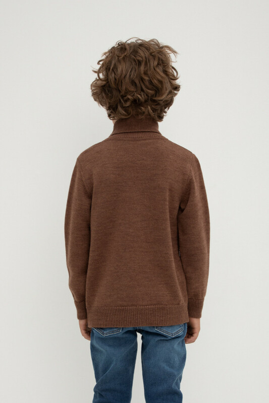 Вязаный джемпер для мальчика из мягкой полушерстяной пряжи. Высокий воротник с отворотом хорошо защищает от холода. Длинные рукава с манжетами. Внизу эластичный пояс. Изделие сохраняет форму и стойкий цвет после многочисленных стирок.