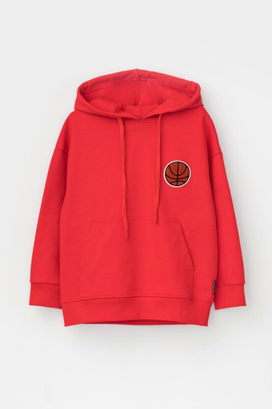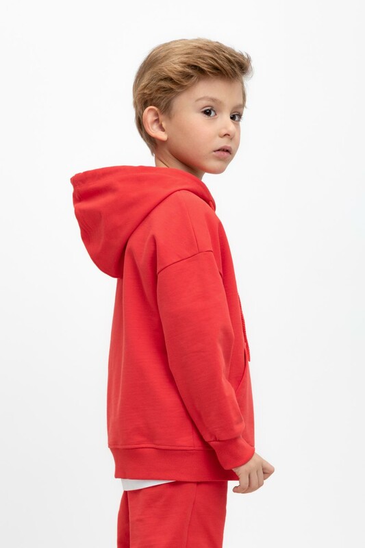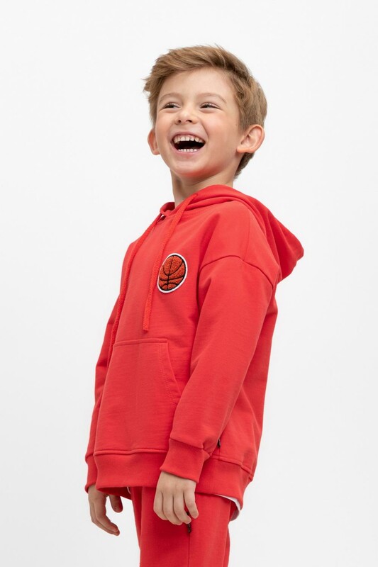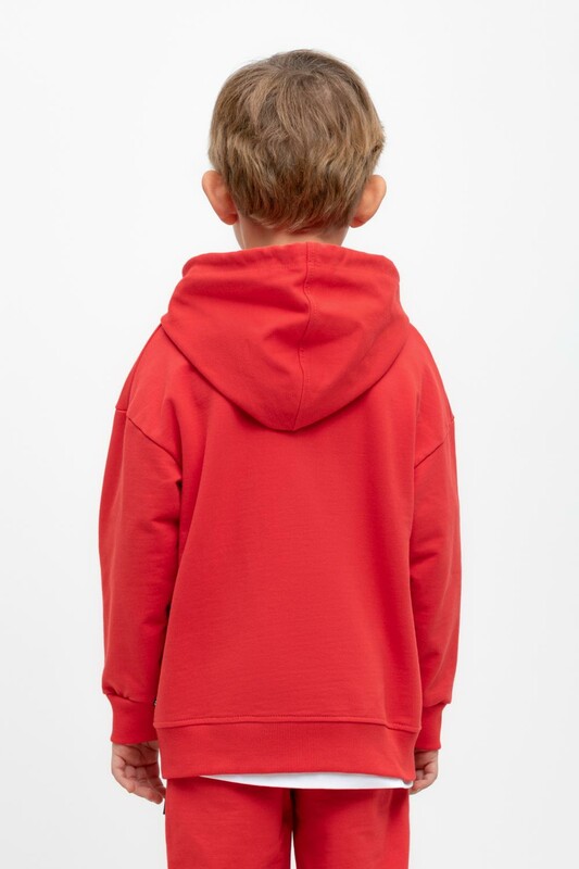 Худи с капюшоном для мальчика из петельчатого футера. Манжеты и пояс из эластичного трикотажа в рубчик. Спереди удобный карман-кенгуру.