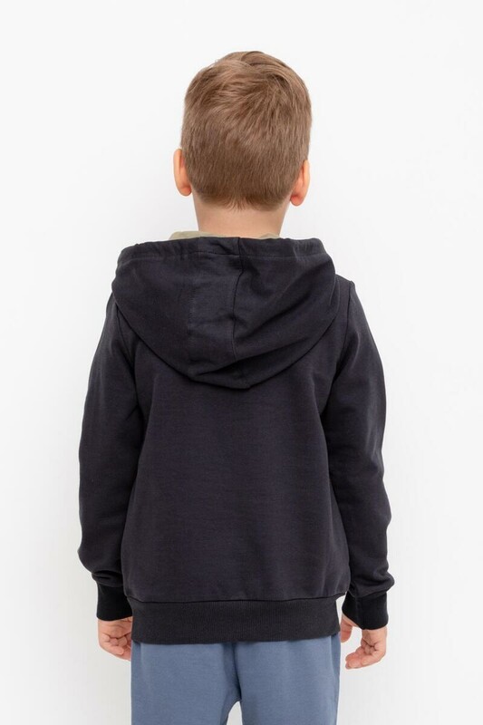 Толстовка с капюшоном для мальчика из однотонного петельчатого футера. Манжеты и пояс из эластичного трикотажа в рубчик. Спереди принт.