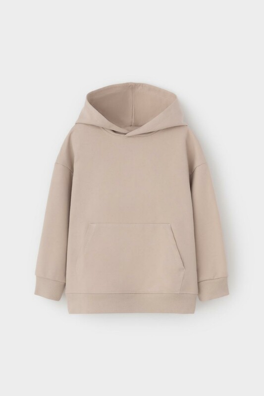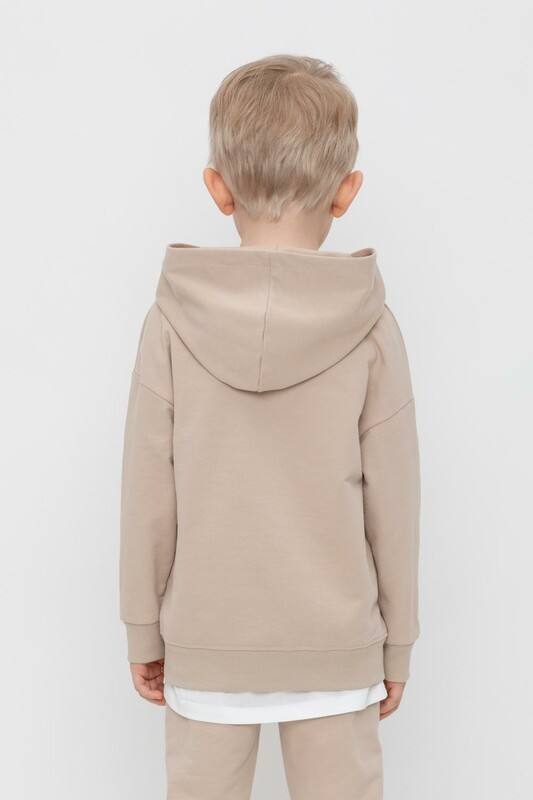 Толстовка с капюшоном для мальчика из футера трехнитки. Манжеты и пояс выполнены из эластичного полотна. Спереди удобный карман-кенгуру.