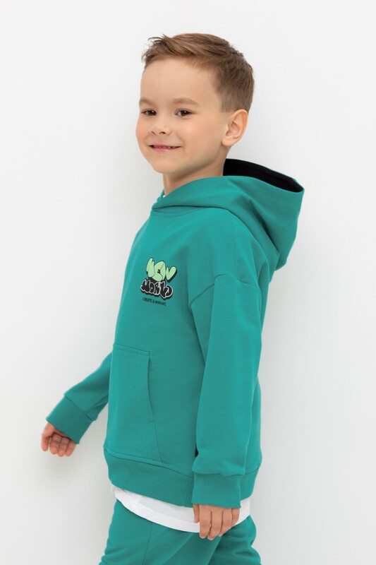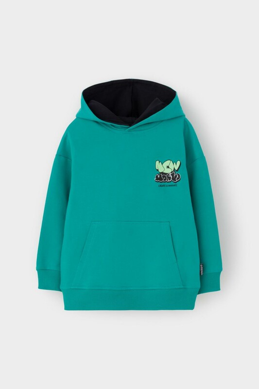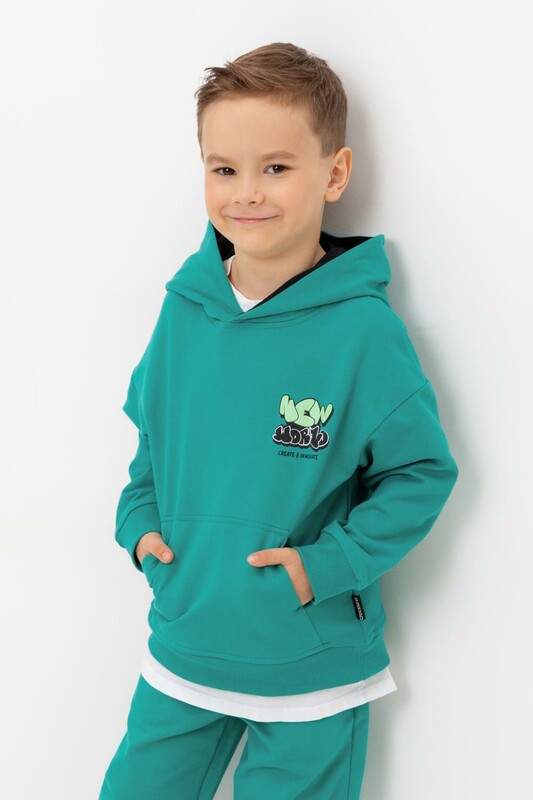 Худи с капюшоном для мальчика из петельчатого футера. Манжеты и пояс выполнены из эластичного полотна. Спереди удобный карман-кенгуру.