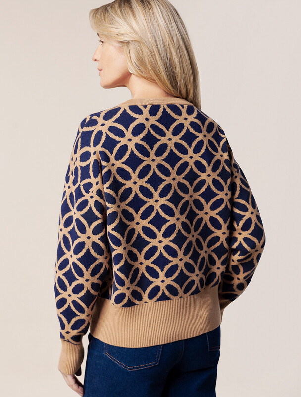 Джемпер жаккардовой вязки выполнен из мягкой пряжи на основе вискозы с добавлением кашемира. Очень приятная на ощупь пряжа дарит абсолютный комфорт, сохраняя оптимальную температуру не перегревая. Совет стилиста: модель с круглым вырезом и спущенной линией плеч гармонично дополнит повседневные образы с джинсами или брюками, при этом будет также выигрышно сочетаться с юбкой в заправку.