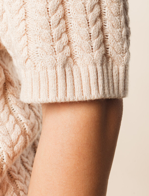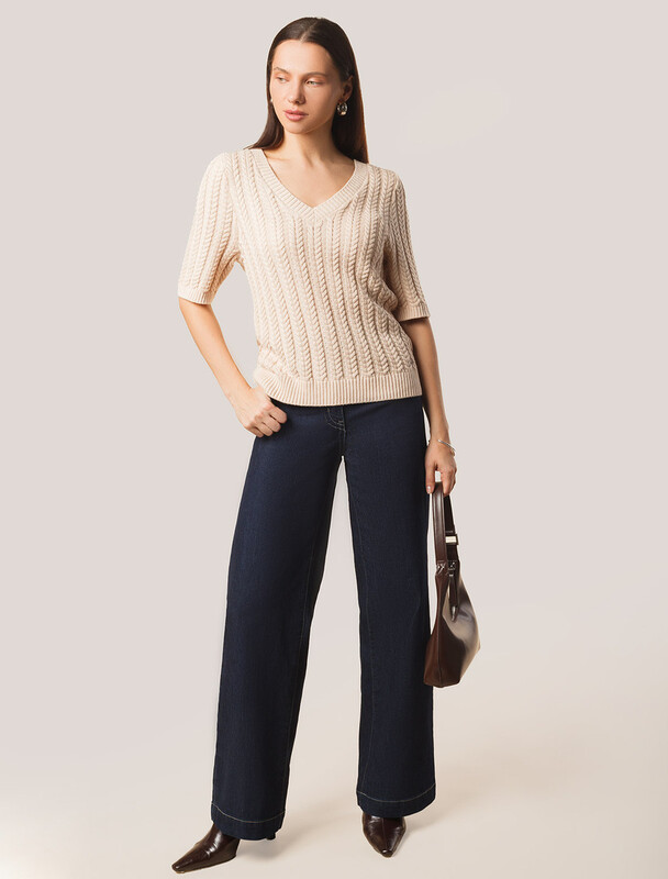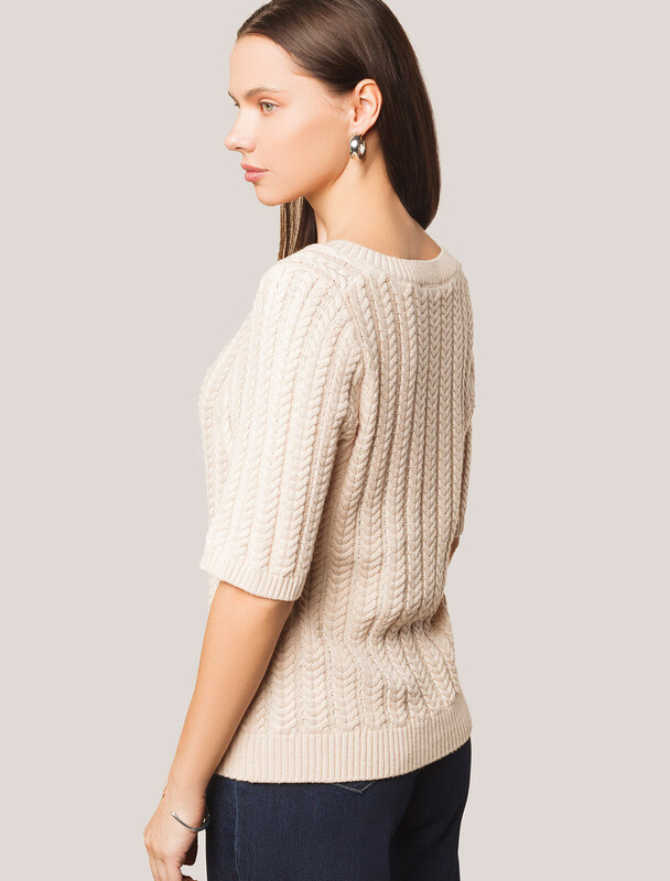 Джемпер фактурной вязки выполнен из хлопка с добавлением кашемира. Модель с V-вырезом с вывязанным орнаментом цепи. Мягкая и очень приятная пряжа совершенно не колется, сохраняет тепло при этом не перегревая, гарантируя безупречный комфорт.