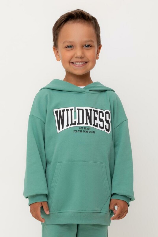 Трикотажное худи с капюшоном из однотонного петельчатого футера с принтом. Спереди удобный накладной карман-кенгуру. Манжеты и пояс из эластичного трикотажа в рубчик.