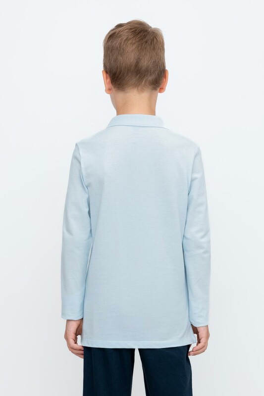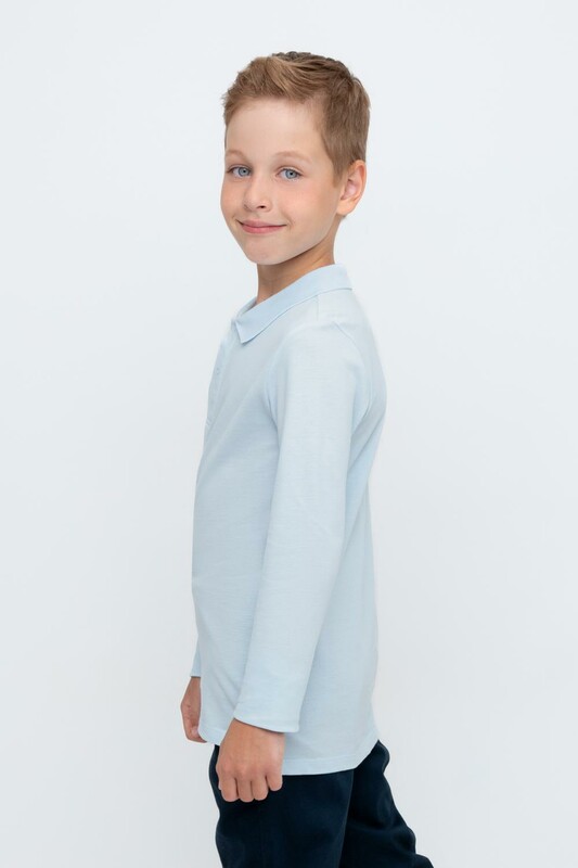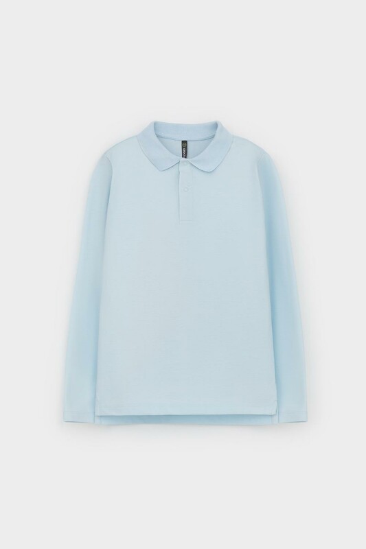 Джемпер поло с длинными рукавами для мальчика из трикотажного полотна пике. Вязаный воротник. Удобная застежка спереди. По бокам разрезы, обработанные киперной лентой.