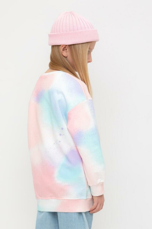 Удлинённый джемпер из петельчатого футера. Спущенные плечи и сборки по низу на рукавах придают свободный объём. Оригинальная набивка выполнена из стойких текстильных гипоаллергенных красителей.