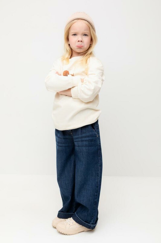 Удлинённый джемпер из петельчатого футера. Спущенные плечи и сборки по низу на рукавах придают свободный объём. Оригинальный принт выполнен из стойких текстильных гипоаллергенных красителей.
