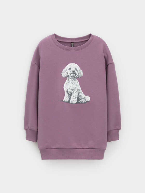 Мягкий удлинённый свитшот для девочки со спущенными рукавами. Изготовлен из высококачественного петельчатого футера трёхнитки. Обтачка горловины, манжеты и пояс выполнены из эластичного полотна. Для удобства в размерах 92 и 98 на спинке имеется застёжка на кнопки. Оригинальный принт выполнен из стойких текстильных красителей. Свитшот сохраняет форму и стойкий цвет после многочисленных стирок и идеально подходит на каждый день. Все трикотажные полотна производятся в соответствии с нормами швейцарского сертификата ЭкоТекс.