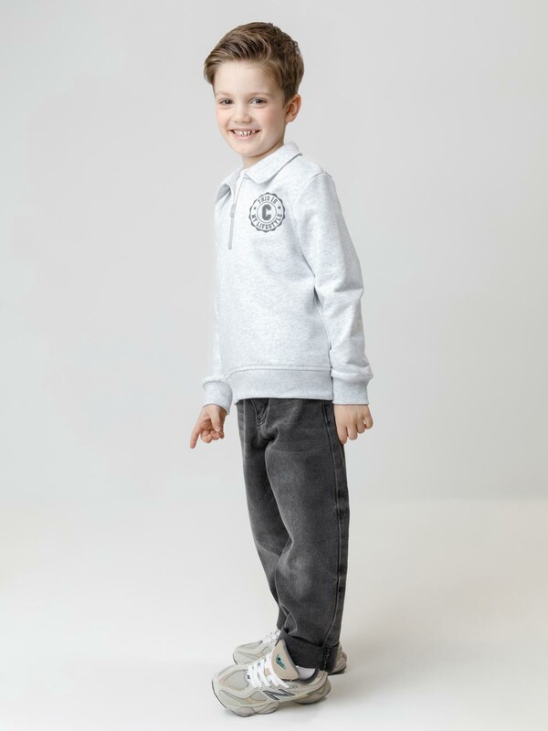 Свитшот с воротником для мальчика. Изготовлен из высококачественного петельчатого футера. В составе 80% натурального хлопка и 20% полиэстера, при этом полиэстер ввязан внутрь по особой технологии и не соприкасается с кожей. Манжеты и пояс выполнены из эластичного полотна. На груди короткая застёжка на молнию. Оригинальный принт выполнен из стойких текстильных гипоаллергенных красителей. Изделие сохраняет цвет и форму после многократных стирок.