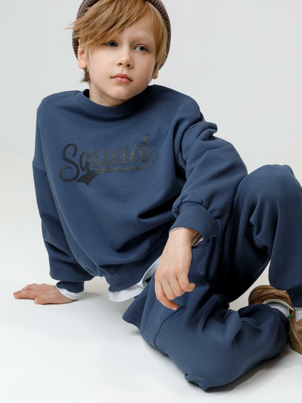 Свитшот для мальчика из высококачественного петельчатого футера. Обтачка горловины, манжеты и пояс выполнены из эластичного полотна. В размерах 92 и 98 на спинке имеется застёжка на кнопки. Оригинальный принт нанесён с помощью стойких текстильных гипоаллергенных красителей.
