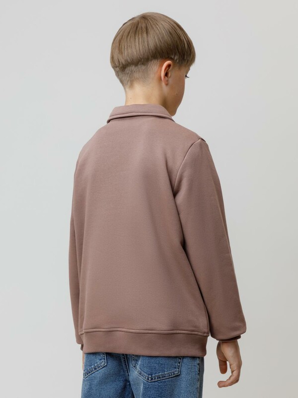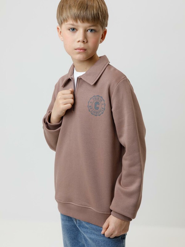 Свитшот с воротником для мальчика. Изготовлен из высококачественного петельчатого футера. В составе 80% натурального хлопка и 20% полиэстера, при этом полиэстер ввязан внутрь по особой технологии и не соприкасается с кожей. Манжеты и пояс выполнены из эластичного полотна. На груди короткая застёжка на молнию. Оригинальный принт выполнен из стойких текстильных гипоаллергенных красителей. Изделие сохраняет цвет и форму после многократных стирок.