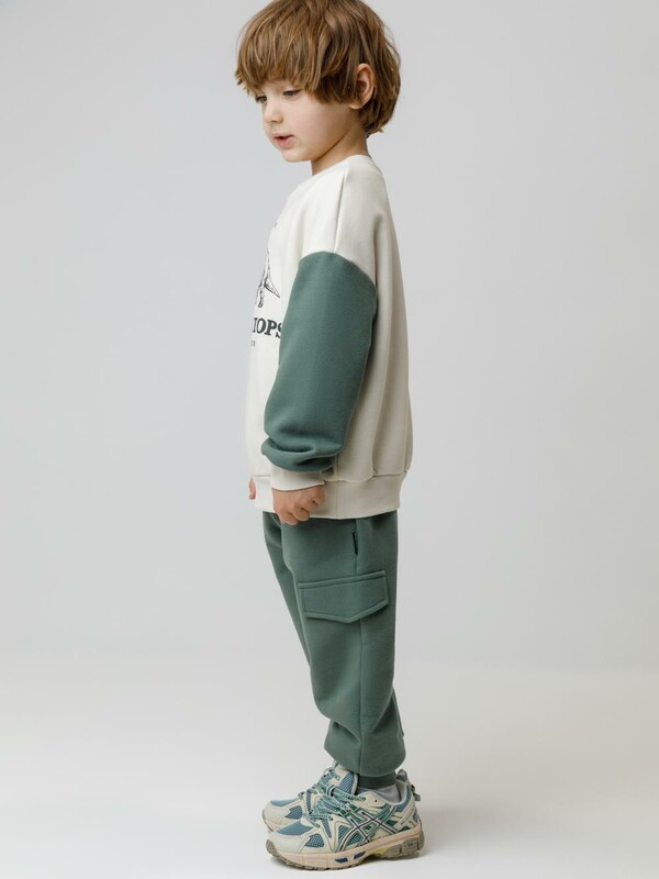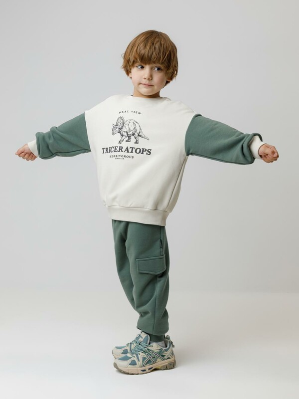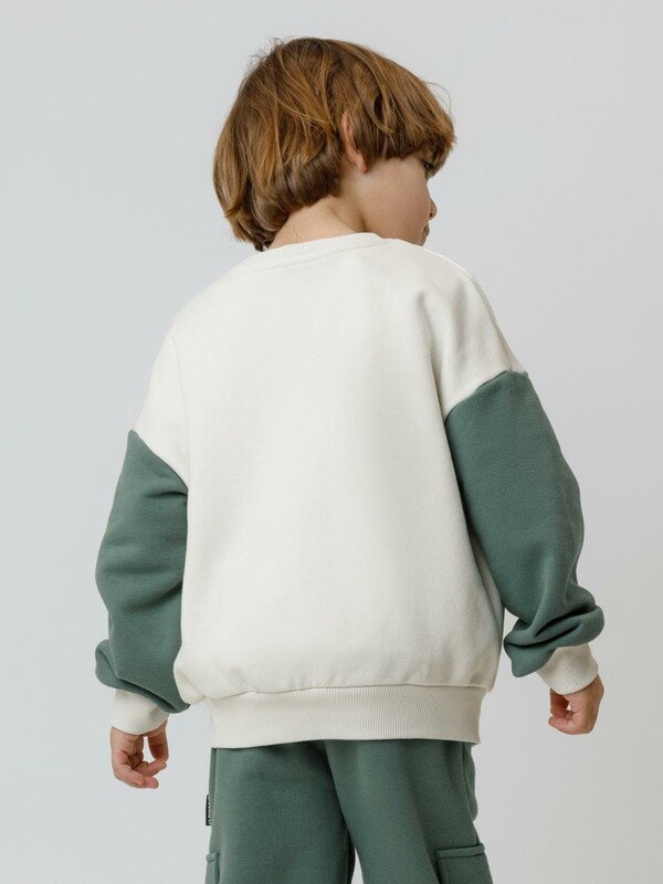 Свитшот для мальчика из высококачественного петельчатого футера трёхнитки. В составе 80% натурального хлопка и 20% полиэстера, при этом полиэстер ввязан внутрь по особой технологии и не соприкасается с кожей. Обтачка горловины, манжеты и пояс выполнены из эластичного полотна. Для удобства одевания имеется застёжка на кнопки в размерах 92 и 98. Оригинальный принт нанесён с помощью стойких текстильных гипоаллергенных красителей.