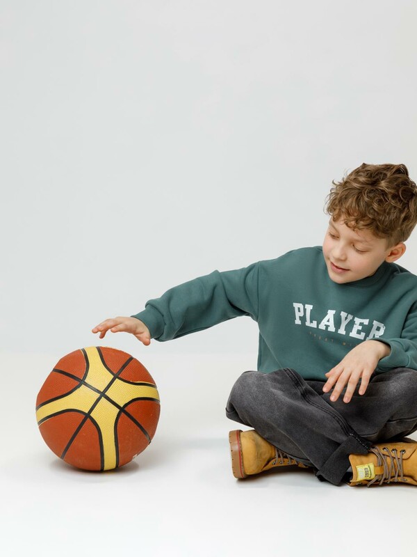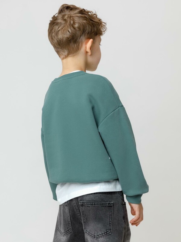 Тёплый свитшот для мальчика из мягкого футера с начёсом. Обтачка горловины, манжеты и пояс выполнены из эластичного полотна. В размерах 92 и 98 на спинке имеется застёжка на кнопки. Оригинальный принт нанесён с помощью стойких текстильных гипоаллергенных красителей.