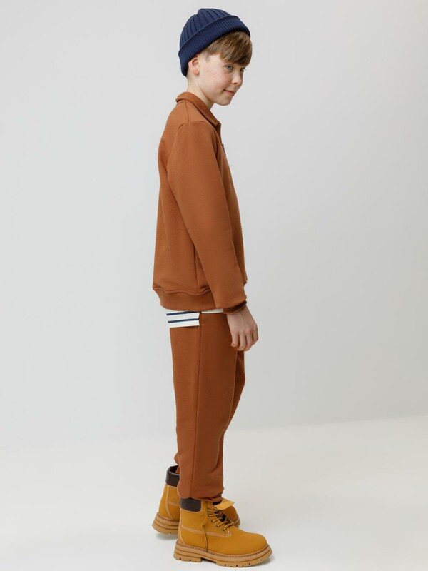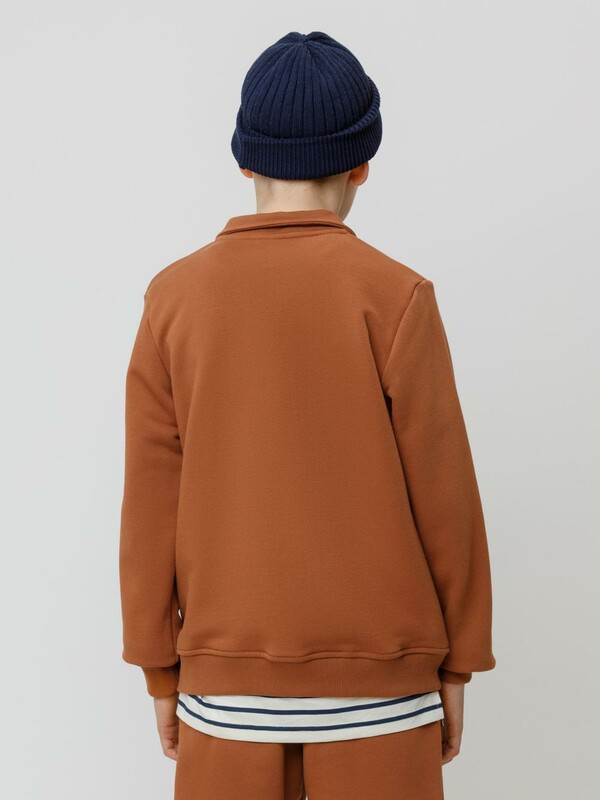 Свитшот с воротником для мальчика. Изготовлен из высококачественного петельчатого футера. В составе 80% натурального хлопка и 20% полиэстера, при этом полиэстер ввязан внутрь по особой технологии и не соприкасается с кожей. Манжеты и пояс выполнены из эластичного полотна. На груди короткая застёжка на молнию. Оригинальный принт выполнен из стойких текстильных гипоаллергенных красителей. Изделие сохраняет цвет и форму после многократных стирок.