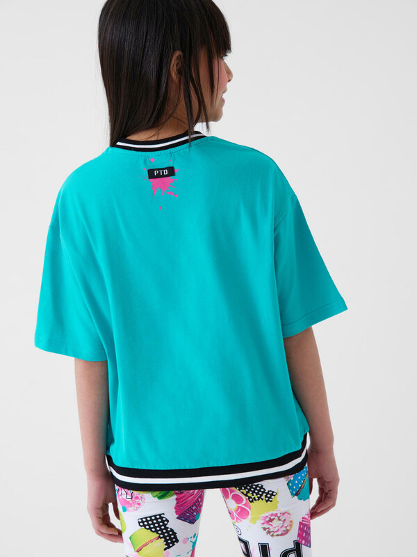 Футболка оверсайз для девочки подростка. Модель выполнена из эластичного хлопкового трикотажа джерси. На груди расположен крупный красочный принт. Горловина и низ обработаны эластичным рибом.