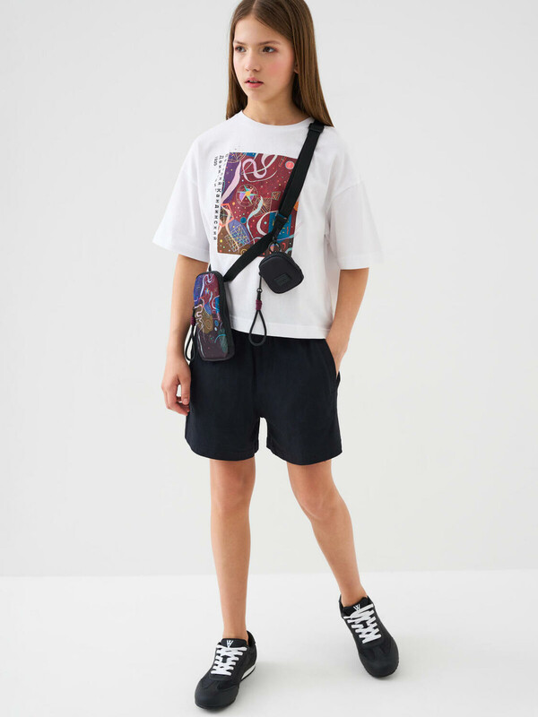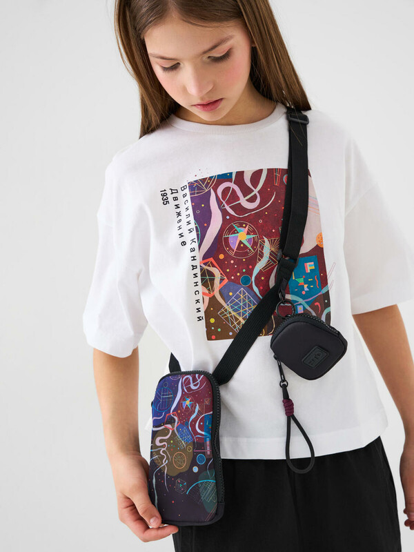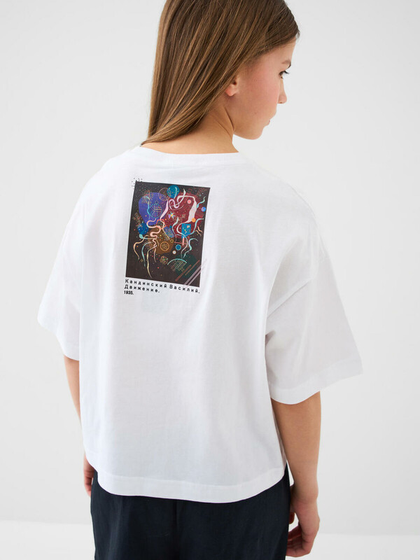 Футболка оверсайз для девочки подростка. Модель выполнена из мягкого хлопкового трикотажа джерси. На футболке изображена картина Василия Кандинского под названием «Движение», созданная в 1935 году. На спине — компактный принт с похожей тематикой. Горловина круглая, обработана эластичным рибом.