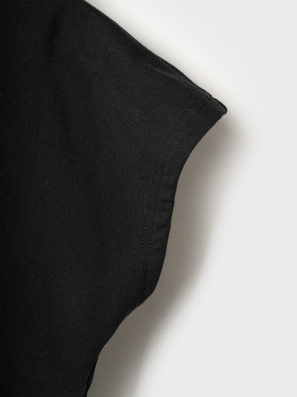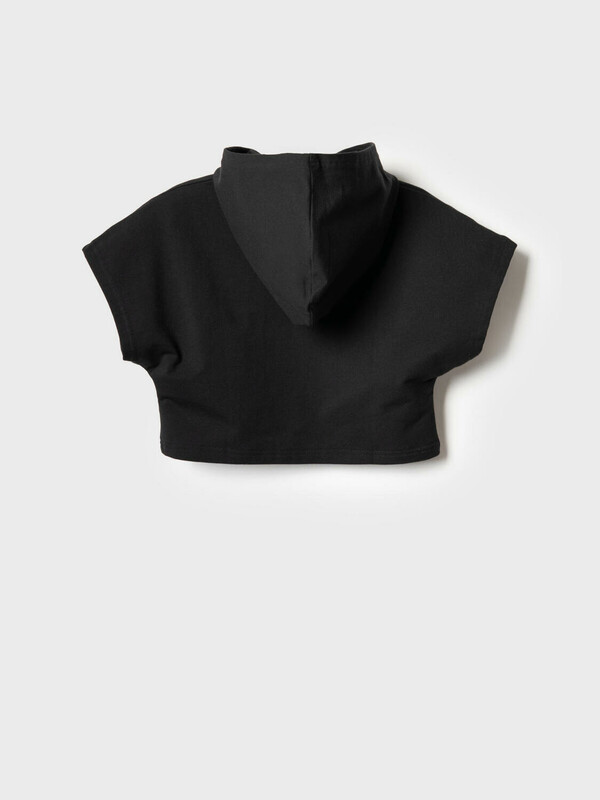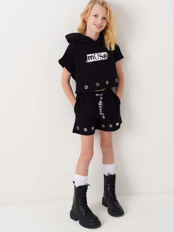 Футболка оверсайз с капюшоном для девочки подростка. Модель укороченная, выполнена из эластичного хлопкового трикотажа футер. На груди расположен крупный принт. По низу декоративные вырезы с металлическими кольцами.