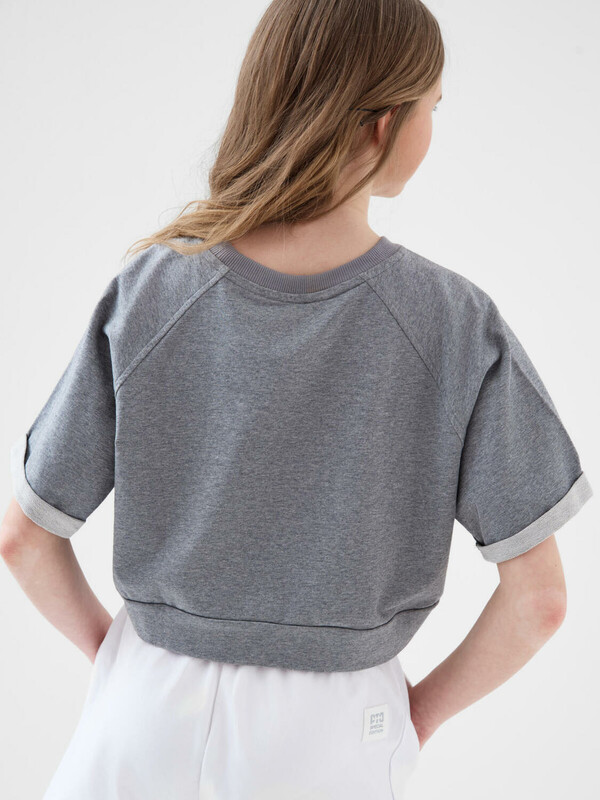 Футболка оверсайз для девочки подростка. Модель укороченная, выполнена из эластичного хлопкового трикотажа футер. На груди расположен крупный принт. Горловина круглая, обработана эластичным рибом.
