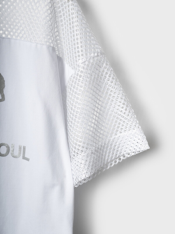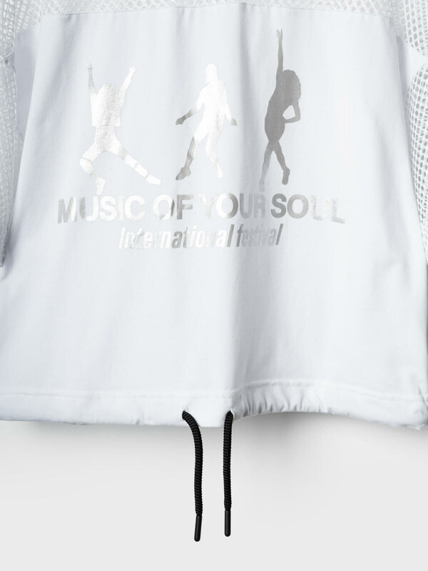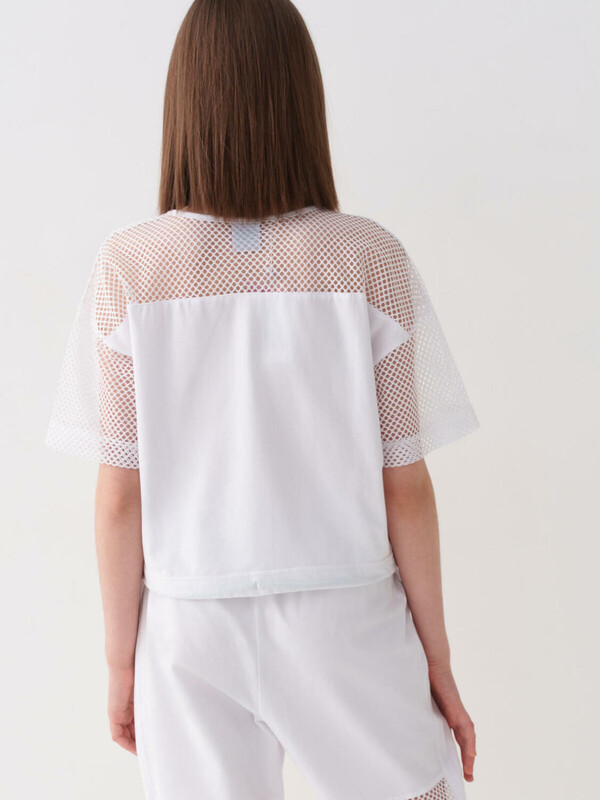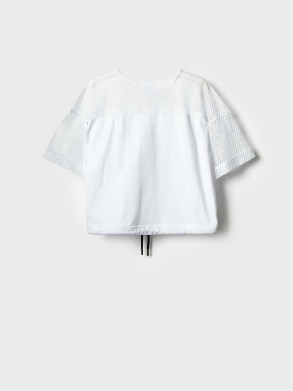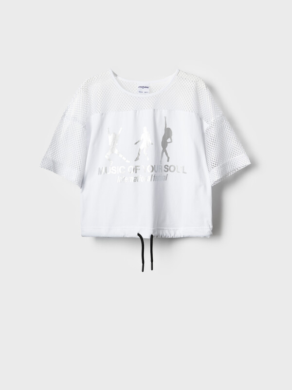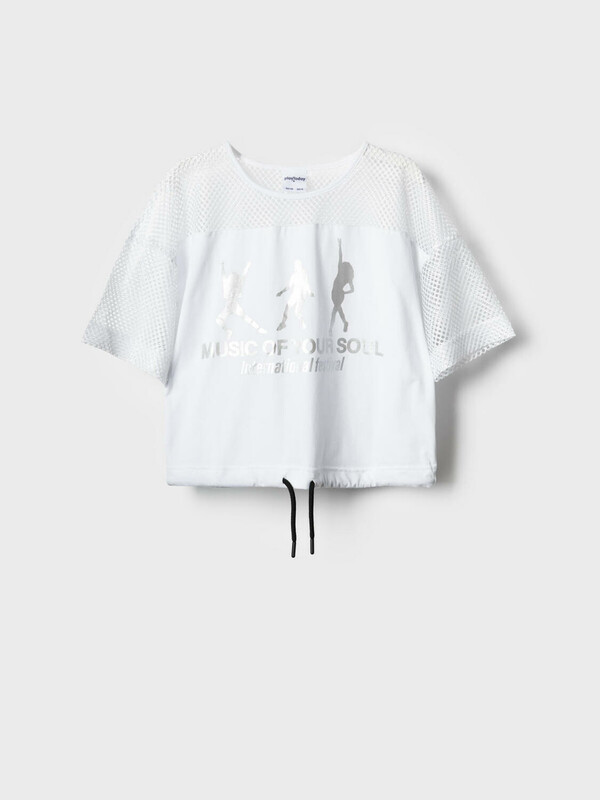 Футболка оверсайз для девочки подростка. Модель выполнена из эластичного хлопкового трикотажа джерси. Рукава и верхняя часть выполнены из сетки. На груди расположен крупный принт. Горловина круглая. В нижней части — шнурок для регулировки посадки.