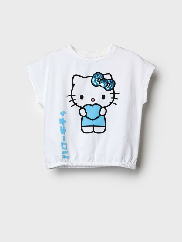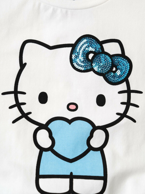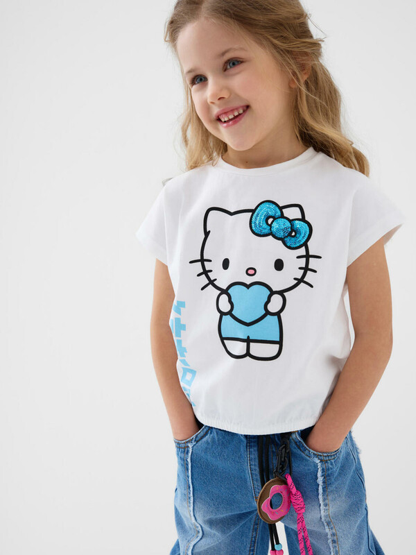 Детская футболка для девочки. Модель свободного кроя, выполнена из эластичного хлопкового трикотажа джерси. На груди расположен крупный принт с любимым персонажем Хэллоу Китти. По низу эластичная резинка.