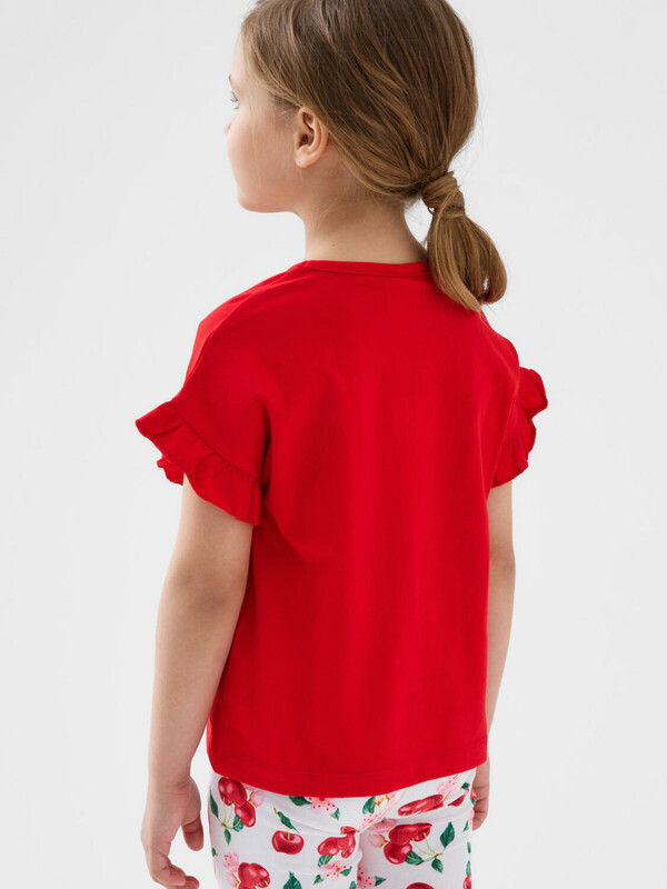 Детская футболка для девочки. Модель свободного кроя, выполнена из эластичного хлопкового трикотажа джерси. Красочный принт с любимыми мультяшными героями Минни и Микки Маус. Горловина круглая. Рукава с оборками.