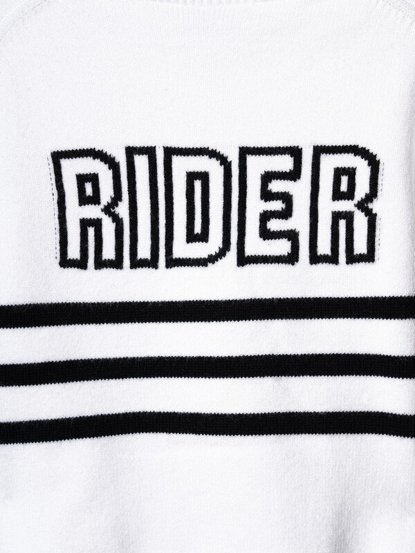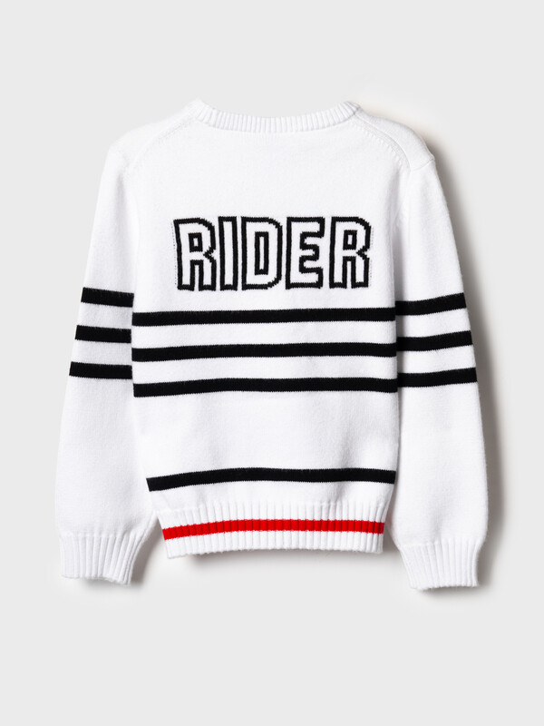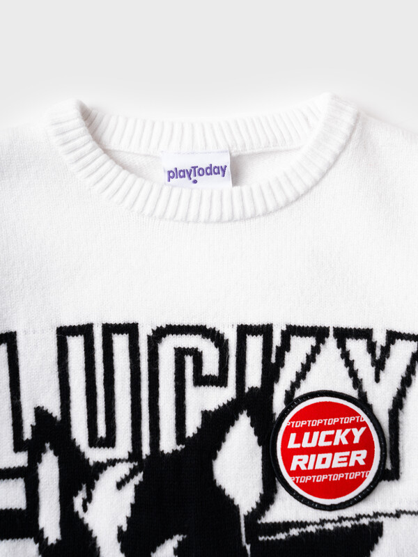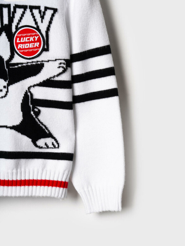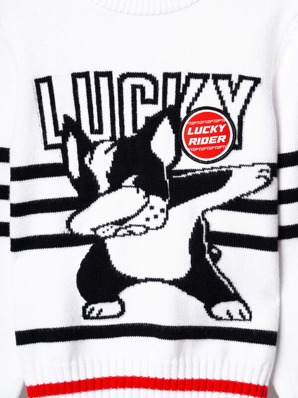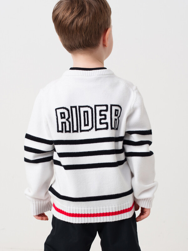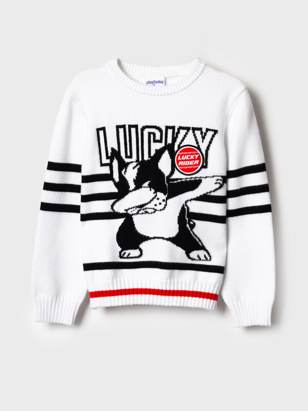 Детский вязаный джемпер для мальчика. На передней части изображён весёлый принт с собакой и крупной надписью. Низ и манжеты из эластичного риба.