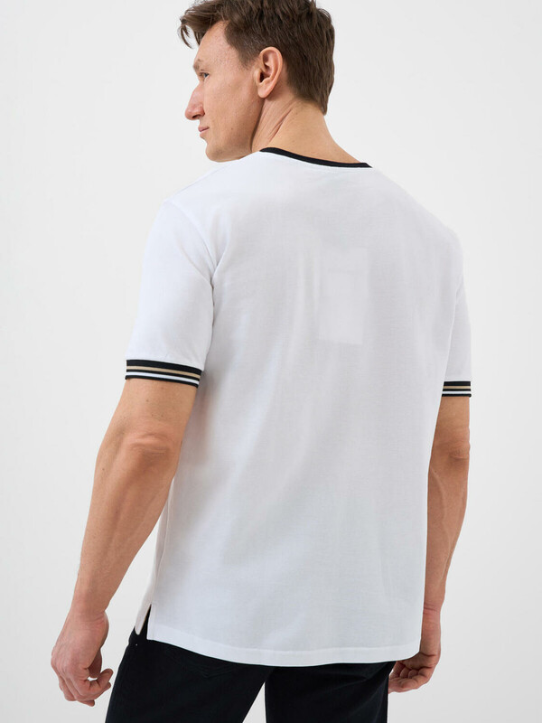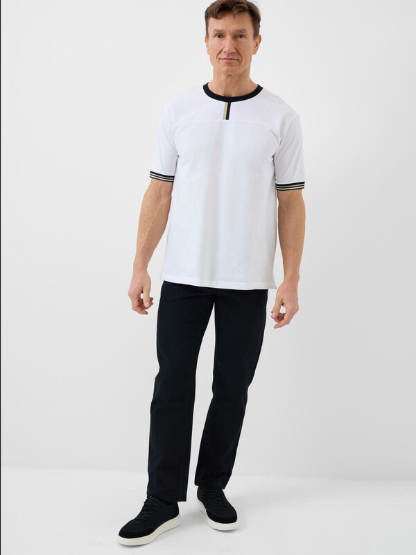 Мужская футболка. Модель прямого кроя, выполнена из эластичного хлопкового трикотажа пике. Горловина круглая, обработана эластичным рибом. Разрезы по бокам.