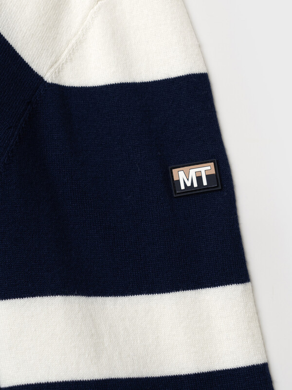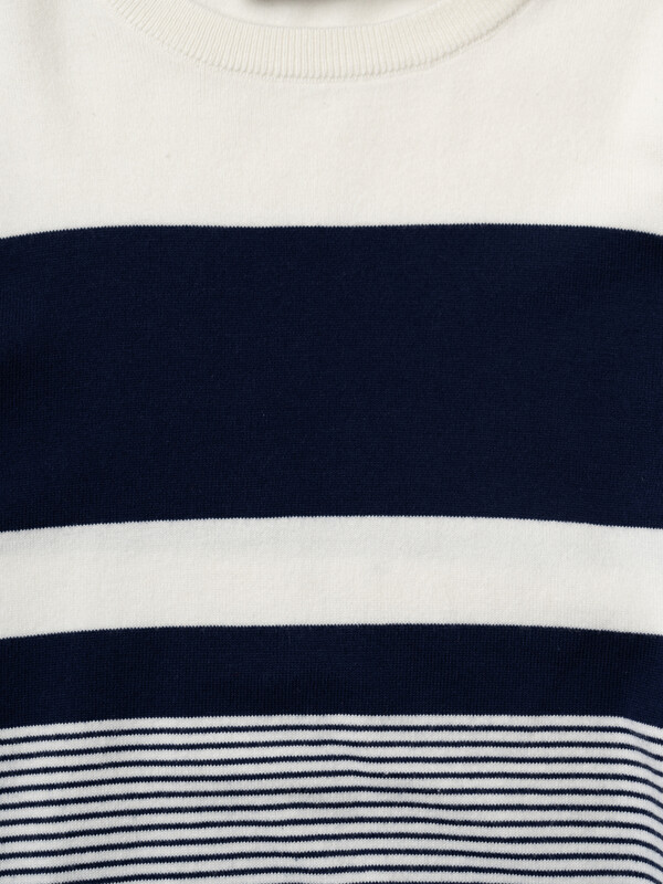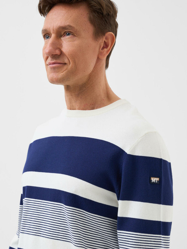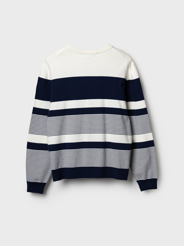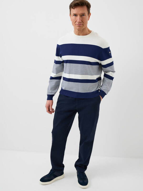 Мужской джемпер. Модель с длинными рукавами и классическим круглым вырезом. Выполнен из вязаного трикотажа и украшен стильным принтом в полоску. Горловина, манжеты и низ изделия обработаны эластичным рибом, что обеспечивает комфортную посадку. На левом рукаве - небольшая фирменная нашивка.