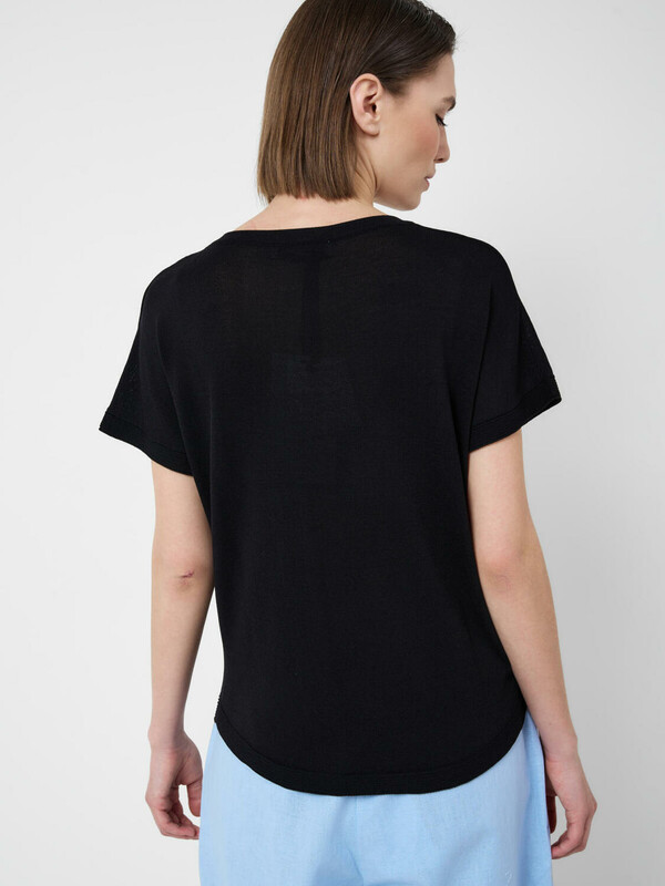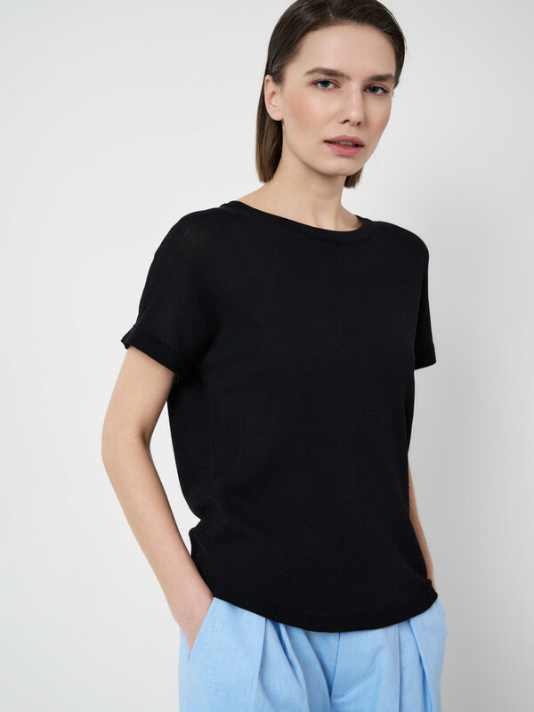 Женский джемпер. Модель свободного кроя, средней длины, выполнен из тонкого мягкого трикотажа. У изделия круглая горловина, короткие рукава и прямой низ.